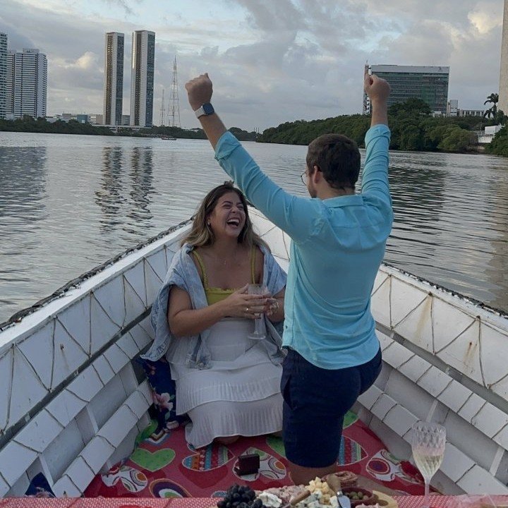 Desde então, não nos desgrudamos mais. As conversas viraram rotina, o carinho e a vontade de estar junto cresceram e em junho de 2022 começamos oficialmente a namorar. O tempo passou e 2 anos 1 mês depois noivamos num passeio de barquinho no Marco Zero, em pleno pôr do sol! (Indicamos eeein, espetacular!)